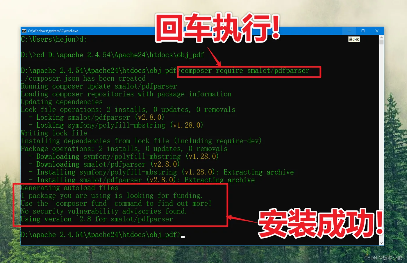 这时候,Composer就帮助我们把smalot/pdfparser这个插件安装到我们的web项目下了!