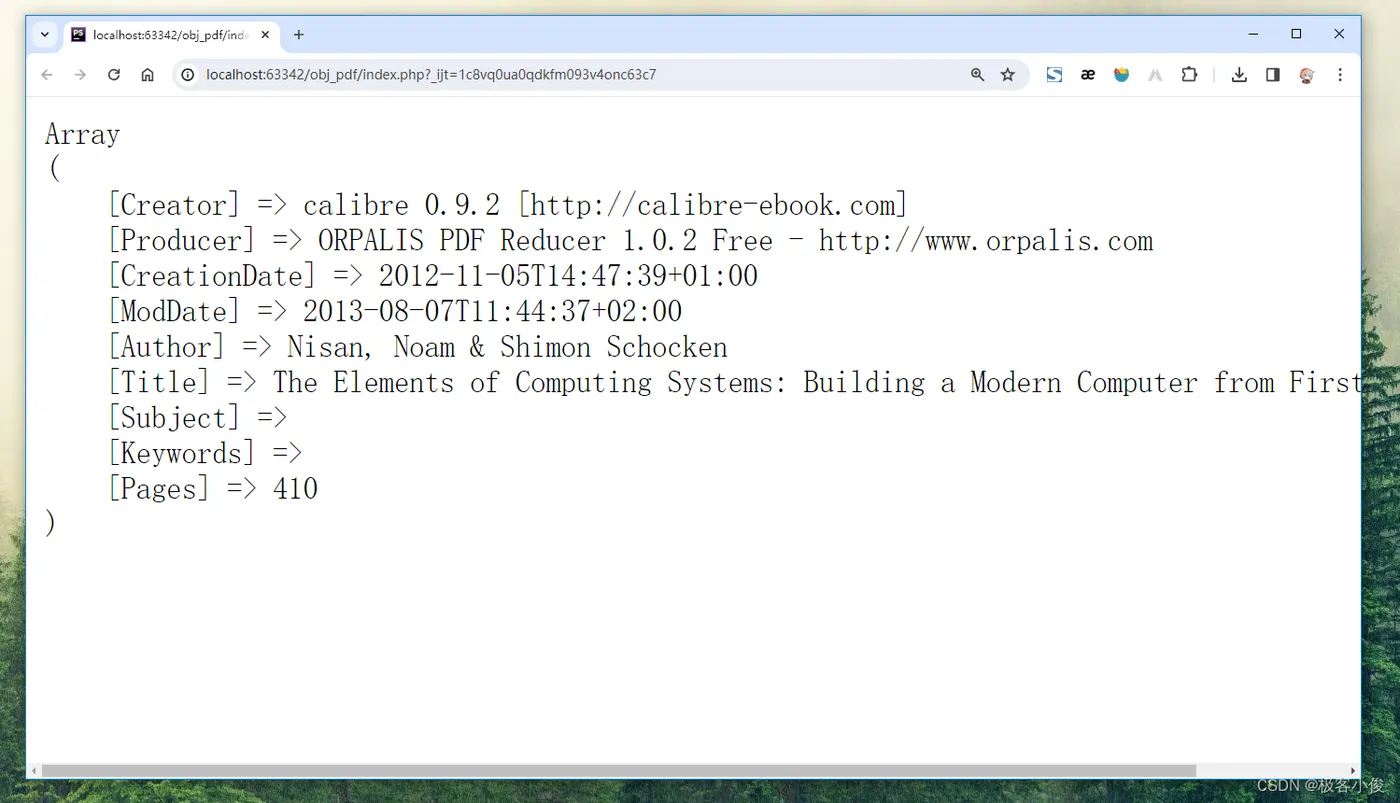 //引入autoload.php include 'vendor/autoload.php'; //创建Parser对象 $parser = new \Smalot\PdfParser\Parser(); //提取PDF文件 $pdf = $parser->parseFile('你自己的PDF文件路径.pdf');